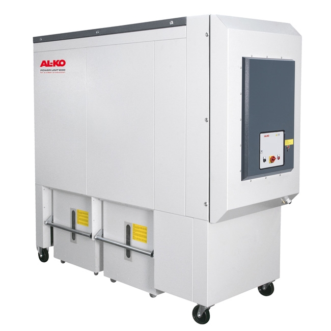 AL-KO POWER UNIT® 200 ist sowohl mit rollbaren Staub- und Spancontainern erhältlich, als auch mit Zellenradschleuse oder integrierter Brikettierpresse.