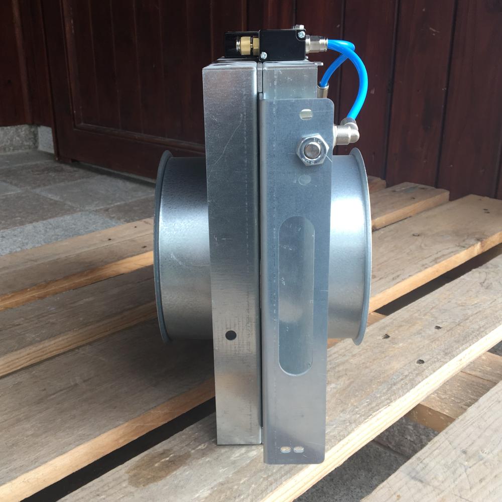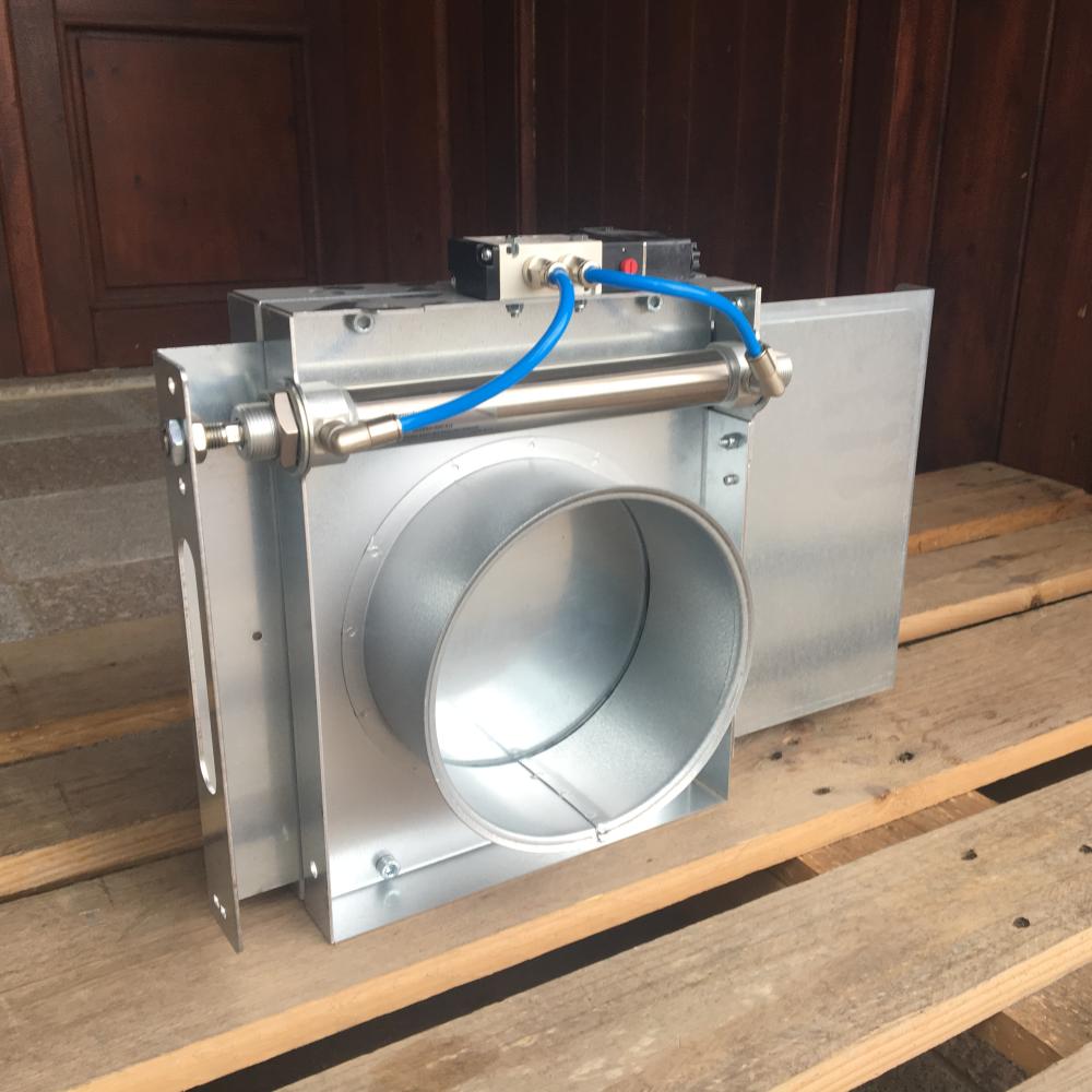 Der pneumatisch betätigte Absperrschieber wird mit einem Pneumatikzylinder angetrieben. Dazu ist eine Steuerleitung für die Spule des Magnetventils und ein Druckluftanschluss nötig. Die Spule vom Magnetventil kann mit 220V, 110V oder 24V~ angesteuert werden.