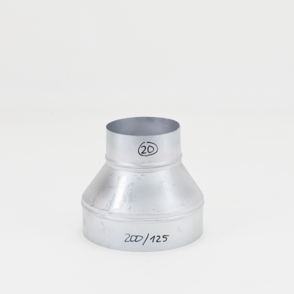 Die Form der Reduzierung ist im Bild erkennbar. Die Reduzierungen verkleinern den Durchmesser. Sie bestehen aus Qualitätsfeinblech und sind nach DIN EN 1506 bzw. DIN EN 12237 sendzimirverzinkt (feuerverzinkt) gefertigt. Die Artikel sind Rückläufer aus Kundenbestellungen.