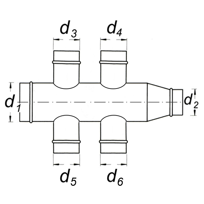 d1>=d2, d3, d4, d5 und d6, d1, d2, d3, d4, d5, d6=entsprechend Auswahl, exzentrisch, Winkel 90°, andere Winkel auf Anfrage möglich!